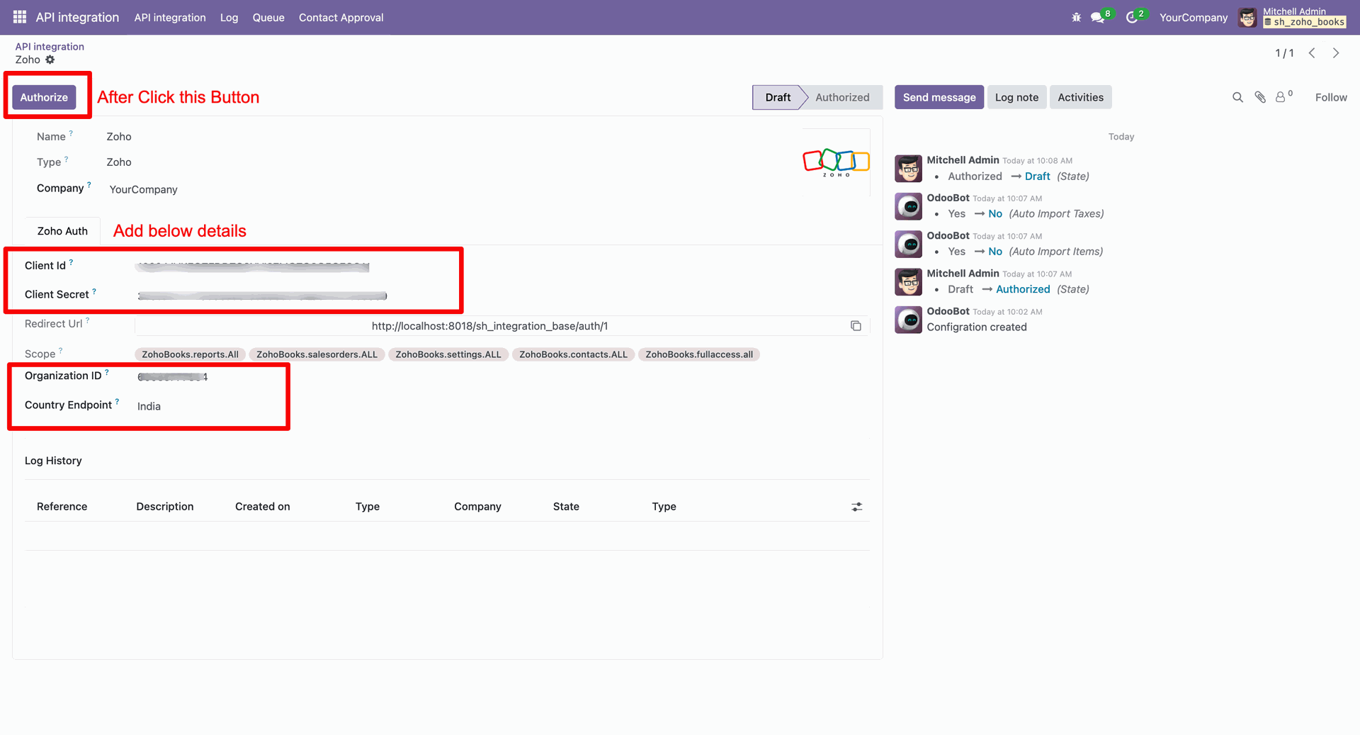 Form view of 'API Integration', fill the required details, and click on the "Authorize" button.