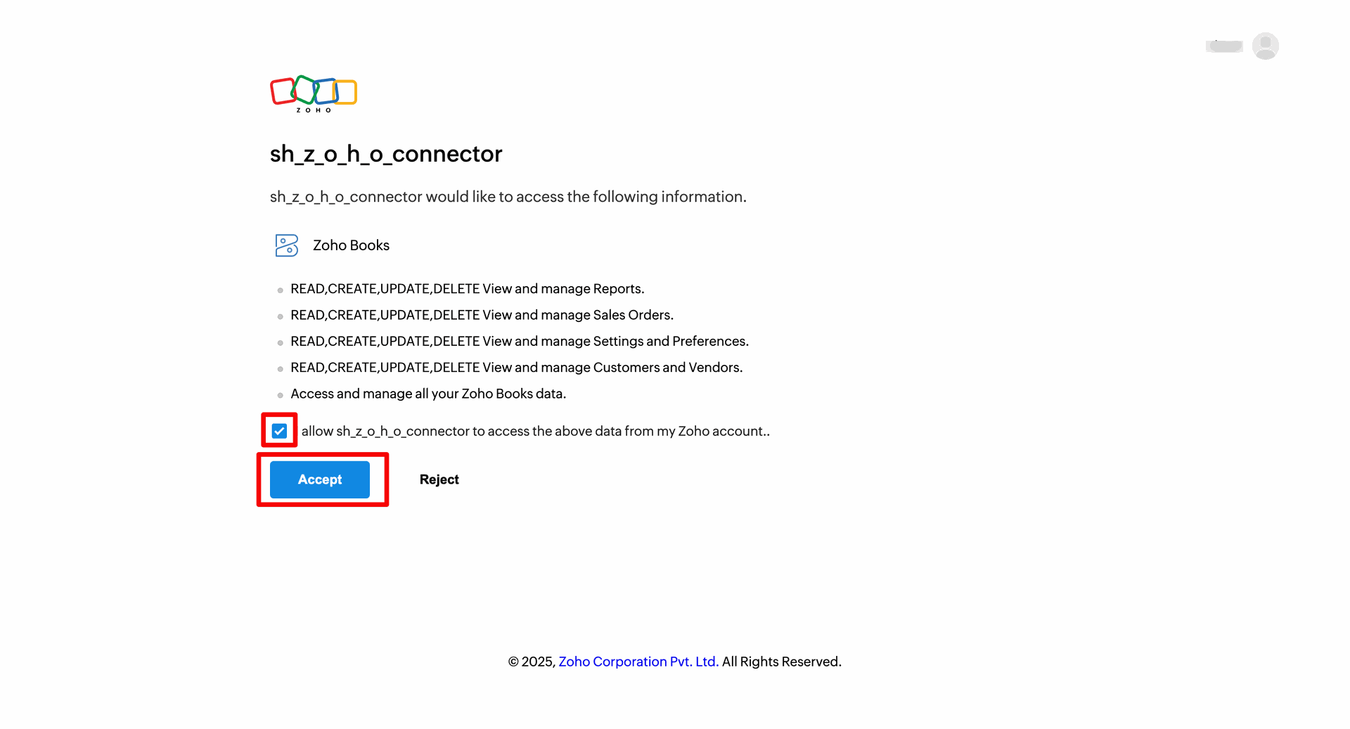 After that, the Zoho connector authorization screen will appear. Enable the access boolean and click on the “Accept” button.