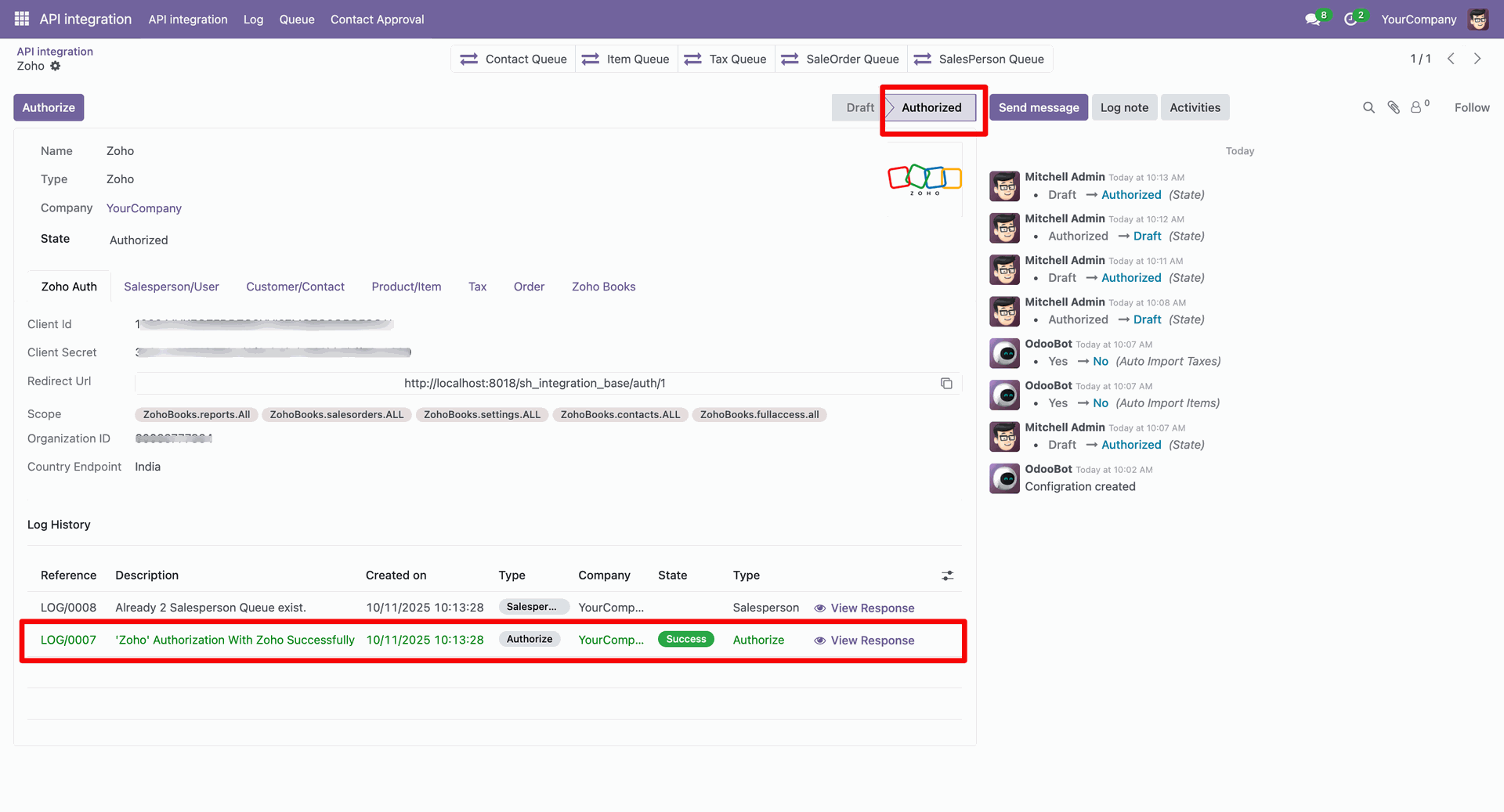 Here, you can see that the stage has changed to "Authorized", and the log history is also visible.